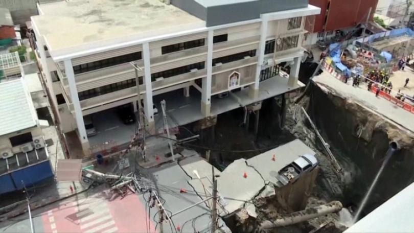 |全球泰國曼谷市區24日突然發生嚴重道路坍塌,面積約900平方公尺、深達50公尺的規模,遠超過過去許多國際案例,而它地點靠近地鐵醫院站出入口施工區域,周邊交通受到嚴重影響。