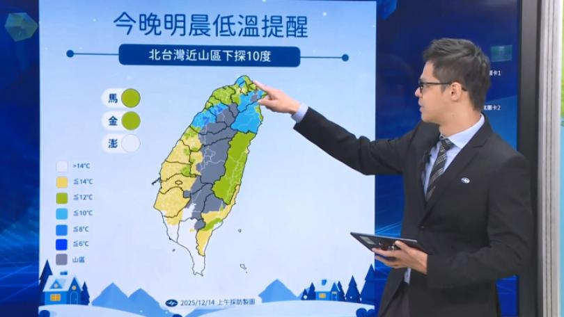 |生活白天雖然出太陽,還是要留意氣溫變化,受到大陸冷氣團及輻射冷卻影響,北部和中南部地區平地低溫12到16°C左右。今(14)晚到明日清晨還會持續降溫,部份地區最低溫將下探到10°C以下。