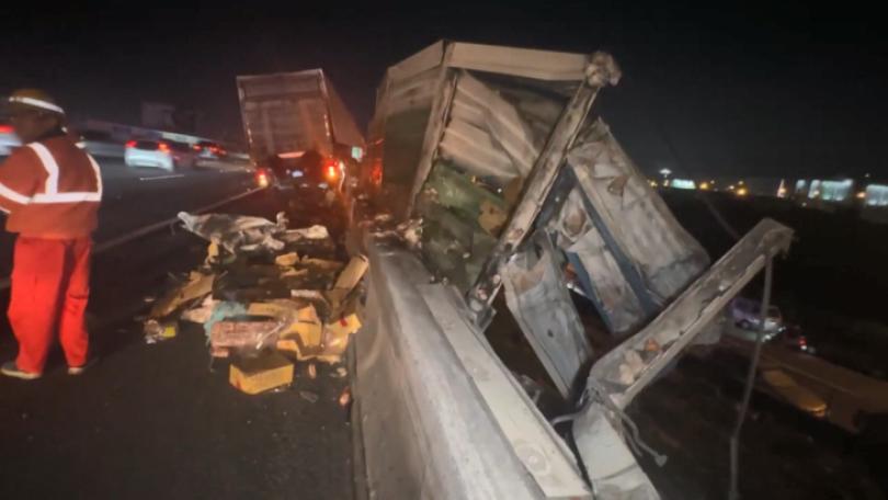 |社會國道1號南向217.3公里員林路段,今(13)日凌晨4時許發生嚴重意外,一名張姓駕駛開著貨櫃車,先是失控自撞護欄,接連引發後方大貨車和2輛自小客車追撞成一團,共有8人受傷送醫,其中張姓駕駛骨折傷勢嚴重,也造成後方塞車長達2公里。