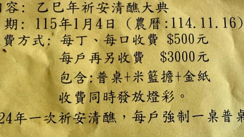 彰化溪湖的震福宮將在明(2026)年1月舉行祈安大典,但最近卻有村民收到廟方公告,指出因為要辦24年一次的祈安清醮,所以除了每人500元的丁口錢之外,每戶還要收每桌3000元的普桌費,引發居民不滿,質疑宗教信仰哪有強制的,律師則表示,宮廟的作法可能涉及強制罪及公然侮辱罪。