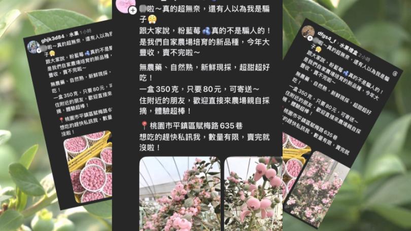 |社會在Facebook與Threads上,日前出現大量貼文以轉讓大同電鍋、自付運費免費送結緣品以及農產品銷售等名目詐騙。桃園就有一間農場被冒名有粉紅藍莓,吸引民眾付費訂購,但陸續傳出受害,農場業者今(6)日也出面澄清,他們沒有粉色藍莓,提醒民眾不要被騙。
