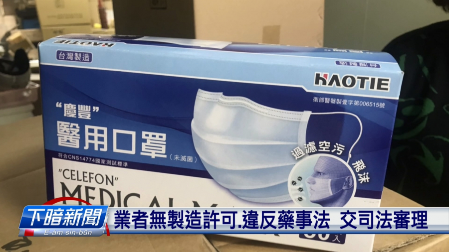 |士林地檢署有接著通報,佇新北市八里區的慶豐公司,無經過核准,就家己咧生產喙罨,初十發動搜索,發現業者攏無消毒,就用手咧橐這寡醫療用品,當場扣押7千外片的醫療喙罨。地檢署也強調,分裝是製造的一部分,若準業者沒有製造許可,就是違反藥事法。 NS ==聲音來源 慶豐公司老闆娘== 他來的時候就50片放在一個袋子 我們就把它裝到我們盒子裡 委託上游廠商製造口罩,再自行分裝到紙盒或是五枚一袋,銷往藥局零售