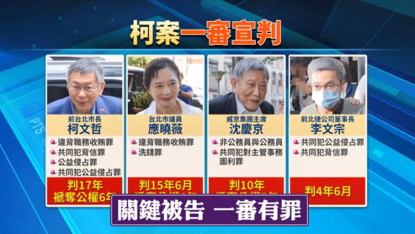 |政治台北地方法院審理京華城案、柯文哲政治獻金案,今(26)日一審宣判,判柯文哲17年徒刑、褫奪公權6年,可上訴,另外應曉薇判15年6月,同樣也是褫奪公權6年。威京集團主席沈慶京與北捷公司前董事長李文宗,則各被判處10年與4年6月徒刑,全案的4名關鍵被告一審都有罪,而面對全案,北檢則回應,收到判決書後,儘速研擬上訴理由,將在期限內提起上訴。