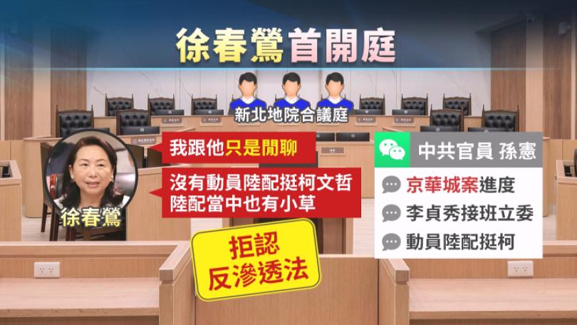 |兩岸台灣新住民發展協會理事長徐春鶯等人,被訴違反《反滲透法》等罪嫌,今(7)日首次開庭。法官在庭上出示,徐春英與中國官員的微信對話訊息,2人曾經談論京華城案進度、李貞秀接班立委等言論,但徐春鶯抗辯「只是閒聊」,不認有犯《反滲透法》,只坦承詐貸跟地下匯兌。